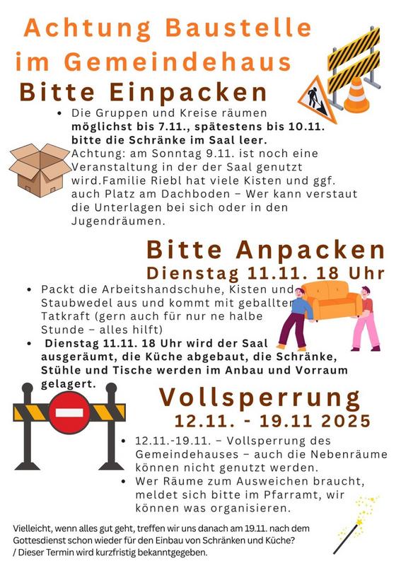 12.11.-19.11. - Vollsperrung des Gemeindehauses - auch die Nebenräume können nicht genutzt werden. Wer Räume zum Ausweichen braucht, meldet sich bitte im Pfarramt, wir können was organisieren.